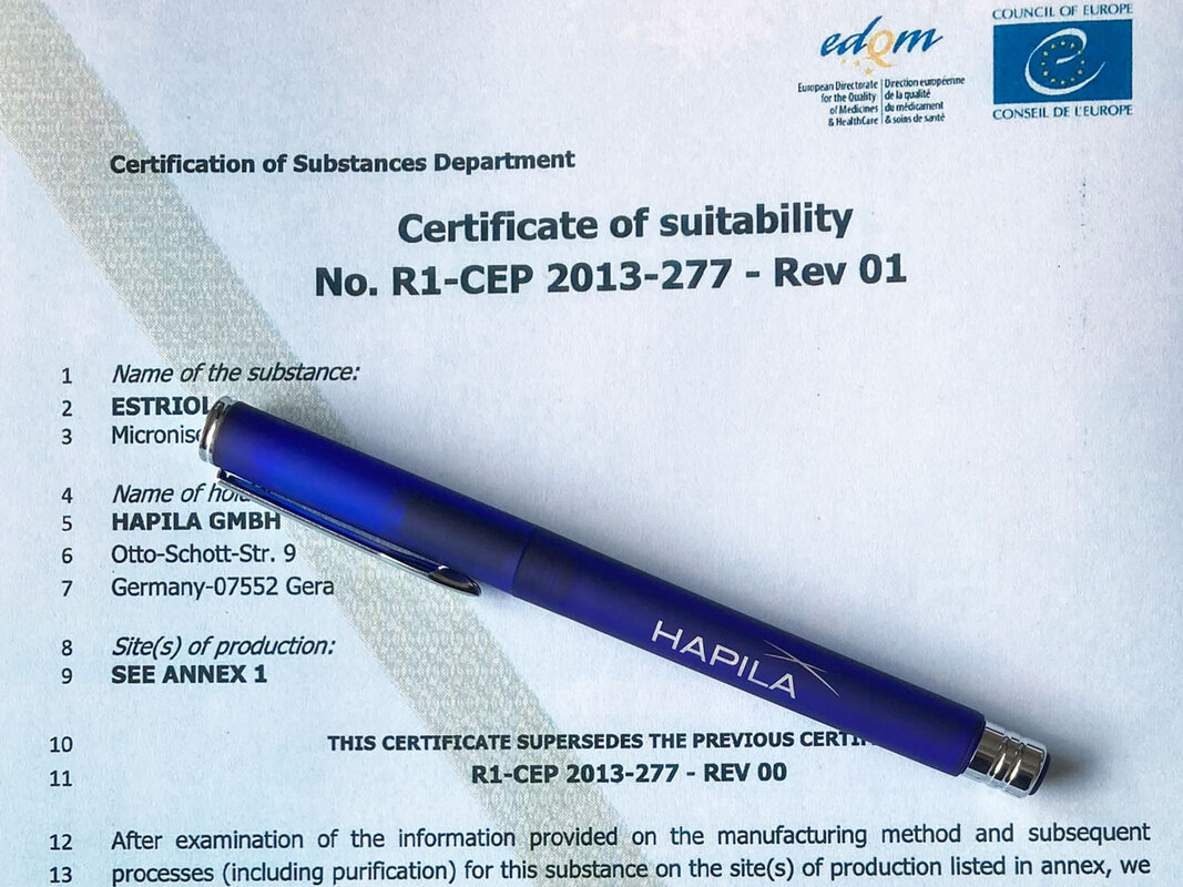Die DIN ISO Zertifizierung umfasst die Entwicklung, Herstellung und den Vertrieb von pharmazeutischen Wirkstoffen (nach GMP) und Referenzsubstanzen sowie Wirkstoffen für In-vitro-Diagnostika, Medizinprodukte und Klinikmuster. Die Überprüfung der Wirksamkeit und Angemessenheit der etablierten Verfahren und Systeme wird durch weitere jährliche Überwachungsaudits erfolgen.
